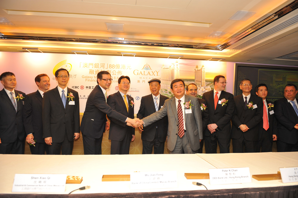圖:銀河娛樂獲得一筆88億港元的銀團貸款,作為澳門綜合性度假項目「澳門銀河」的融資安排。副主席呂耀東(左四)昨與銀團代表簽約