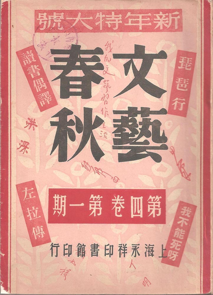 由范泉(一九一六至二○○○)主編,永祥印書館出版的《文藝春秋》,是上海一九四○年代非常重要的文學期刊,自一九四四年十月創刊,出至一九四九年四月的第八卷三期停刊,共出四十四期,跨越五年,是當時難得一見的長壽文學刊物。第一卷出版時,是以叢刊形式出現的,每期有獨立的書名:《兩年》、《星花》、《春雷》、《朝霞》和《黎明》。後來每六期一卷,每卷有劃一的封面設計。