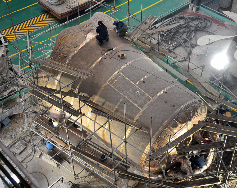 圖:世界上最大的一座佛鐘近日在武漢鑄造成功。圖為工人14日在進行最後的打磨工序