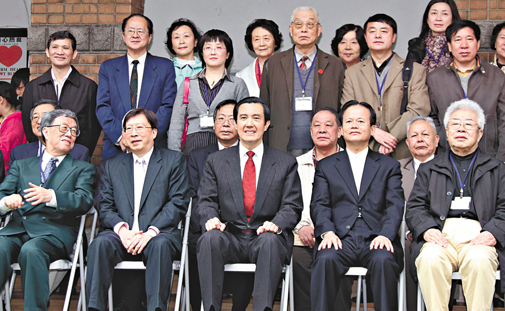 圖:台灣地區領導人馬英九(前排中)與來自全球各地的華文知名作家、學者合影留念,左一為大陸著名作家王蒙,左二為台灣文化總會會長劉兆玄 (中新社)