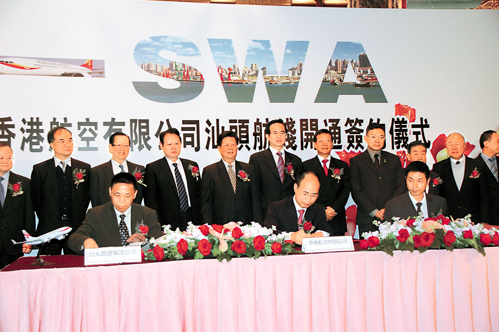 由汕頭市人民政府、香港機場管理局主辦,香港貿易發展局、香港潮屬社團總會、香港航空有限公司協辦的「汕頭機場對外籍飛機開放暨香港航空公司汕頭航線開通簽約儀式」昨日假金鐘香格里拉舉行。 本報記者 黃穎雅