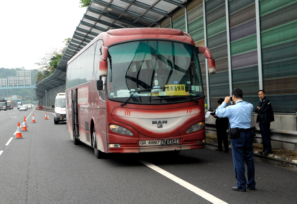 □大埔吐露港公路昨日上演一幕驚險交通意外,一部行走粵港兩地的旅遊巴士,昨日行駛期間,司機突然昏迷,十米長的巴士陷入無人駕駛狀態,並以八十公里時速在公路上左搖右擺。車上乘客驚恐大叫,幸有三名乘客及時作出果斷決定,分別扶穩軚盤及將司機抬出,其中一人權充臨時司機,將巴士駛埋路壆煞停。期間「生死時速」約兩分鐘,全車乘客有驚無險,但肇事司機送院後證實不治。\本報記者 梁衍衡