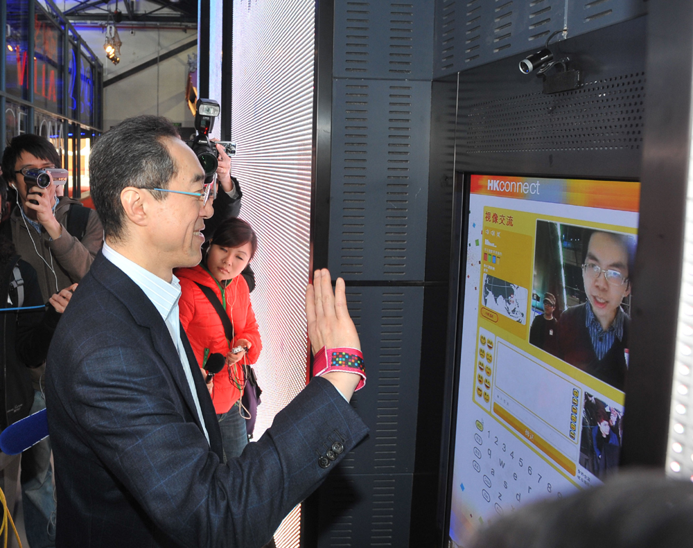 圖:唐英年親身測試互動裝置,透過互相實時連繫與香港科學館參觀者對話