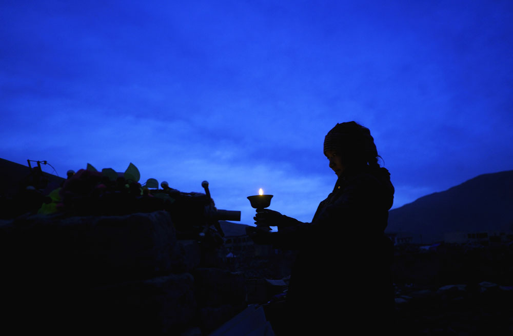 圖:玉樹地震重災區結古鎮藏族群眾在震後廢墟上點亮酥油燈,為劫後餘生的人們祈福      (新華社)
