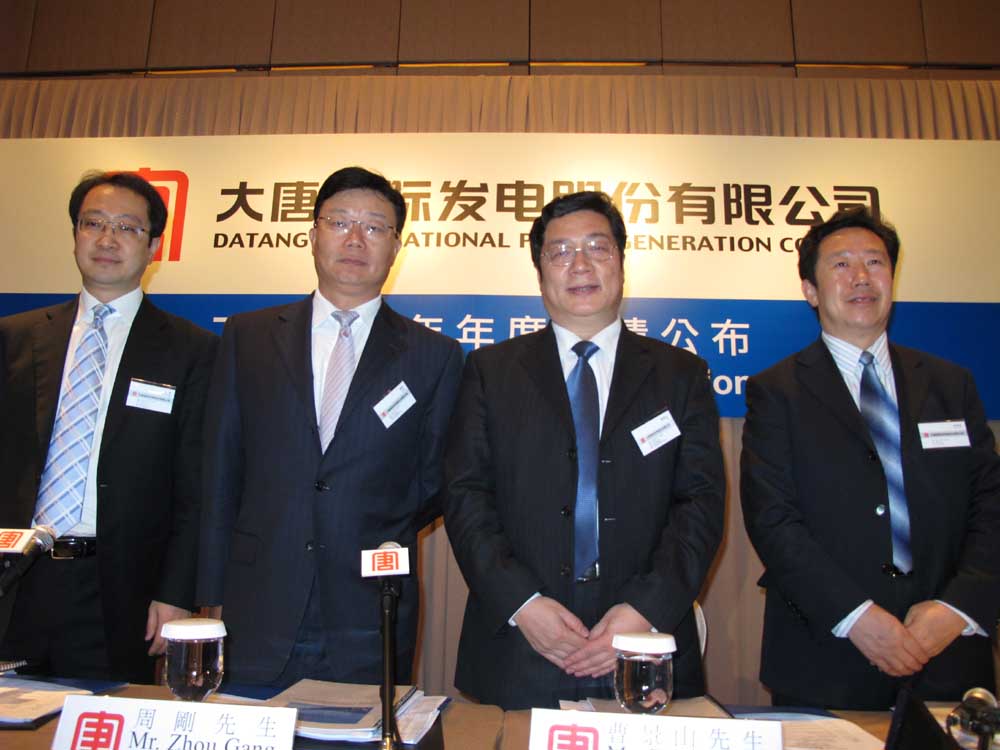 圖:左起:大唐發電證券與資本運營部主任劉岩、副總經理周剛、副董事長兼總經理曹景山、總經理工作部主任李國瑾(本報攝)