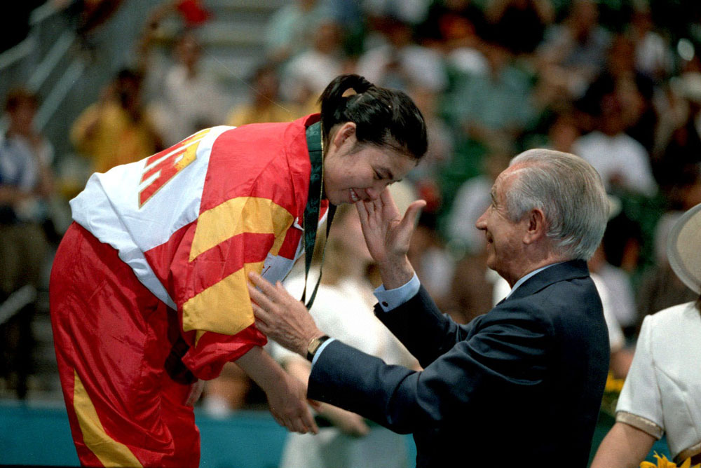 薩馬蘭奇與鄧亞萍忘年交佳話是讓所有國人感慨的故事,尤其是1996年,在亞特蘭大奧運會上,薩馬蘭奇不僅給鄧亞萍頒獎,還像對待自己的孫女一樣,撫摸了一下她的臉頰。這是他第五次為鄧亞萍頒獎。