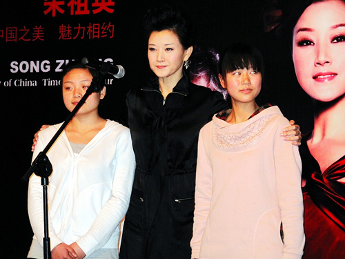 圖:宋祖英攜災區孩子代表亮相上海(本報攝)