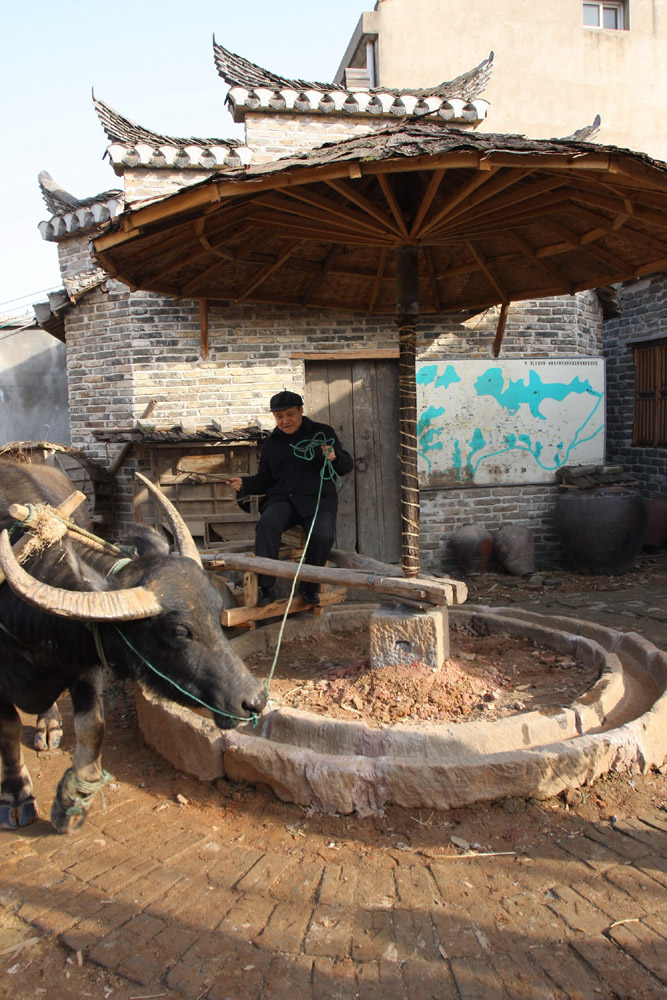 圖:一頭老牛拉着石碾槽碾碎芝麻