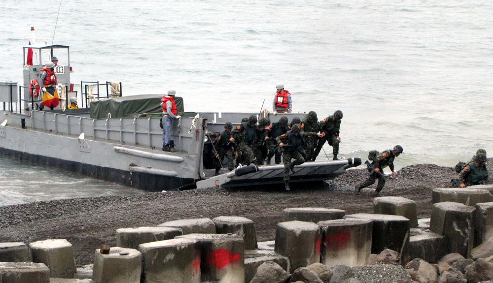 圖:「漢光26號演習」29日在屏東加祿堂海灘,進行兩棲登陸搶灘的演練。圖為搶灘的攻擊軍(中央社)