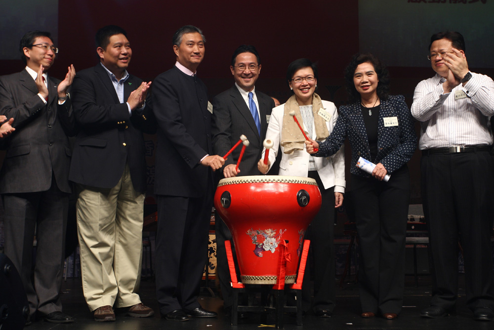 圖:中聯辦青年工作部副部長唐淑蘭(右二),許曉暉(右三)及陳維安(右四)等主禮嘉賓,打鼓為晚會主持開幕式(本報攝)