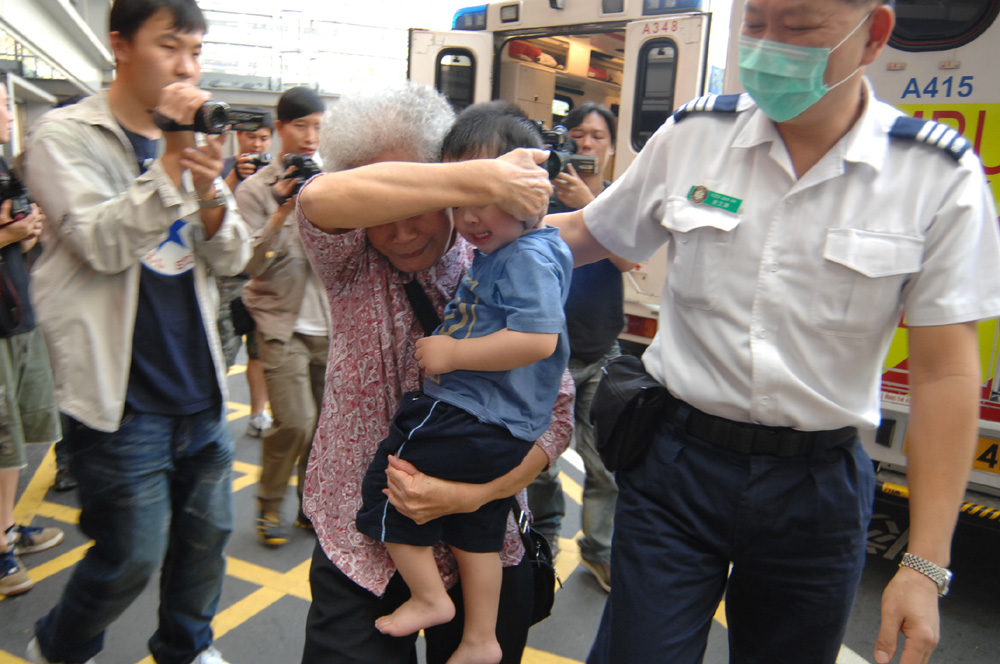 圖:險誤飲松節水男童由外祖母陪同送院檢查(本報攝)