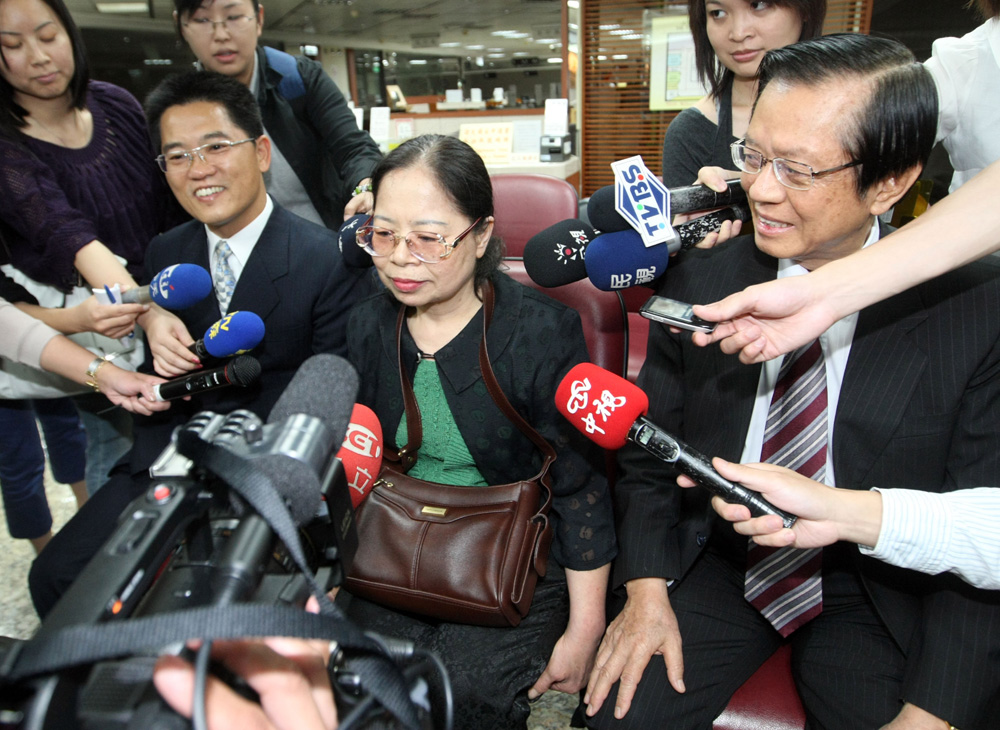 圖:獲選美國《時代》雜誌「英雄人物」的台東菜販陳樹菊(中綠衣者),2日接受多家媒體採訪(中央社)