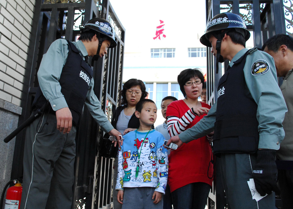 北京市的中小學校及幼兒園即日起加強安全保衛工作,市教委要求實行「手遞手」,即老師親自將學生交予前來迎接的家長。圖為北京小學放學的學生在大門口要經過老師、保安、家長三方確認才能被接離校園。(中新社)