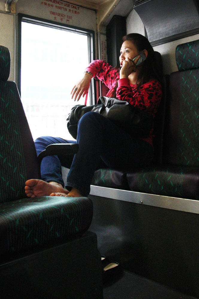 相中這位紅衫阿嬸,獨坐在巴士車廂下層最後一排的角落處,脫下鞋子將一對腳掌翹上前排座位,悠閑自在地講電話。她將巴士座椅儼然當作自家沙發一般,不理會周圍是否有乘客投來異樣目光,或是令其他乘客望而卻步。