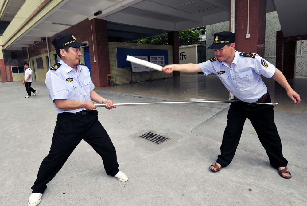 福田警方昨日向轄區內近250所中小學幼兒園配備了千餘件鋼叉、丁字棍、防割手套等警用器械。據福田公安分局特勤大隊長任洪偉稱,警方特意編排了一套丁字棍使用方法,並將教授給學校的保安們,具即戰能力,防控暴力事件。