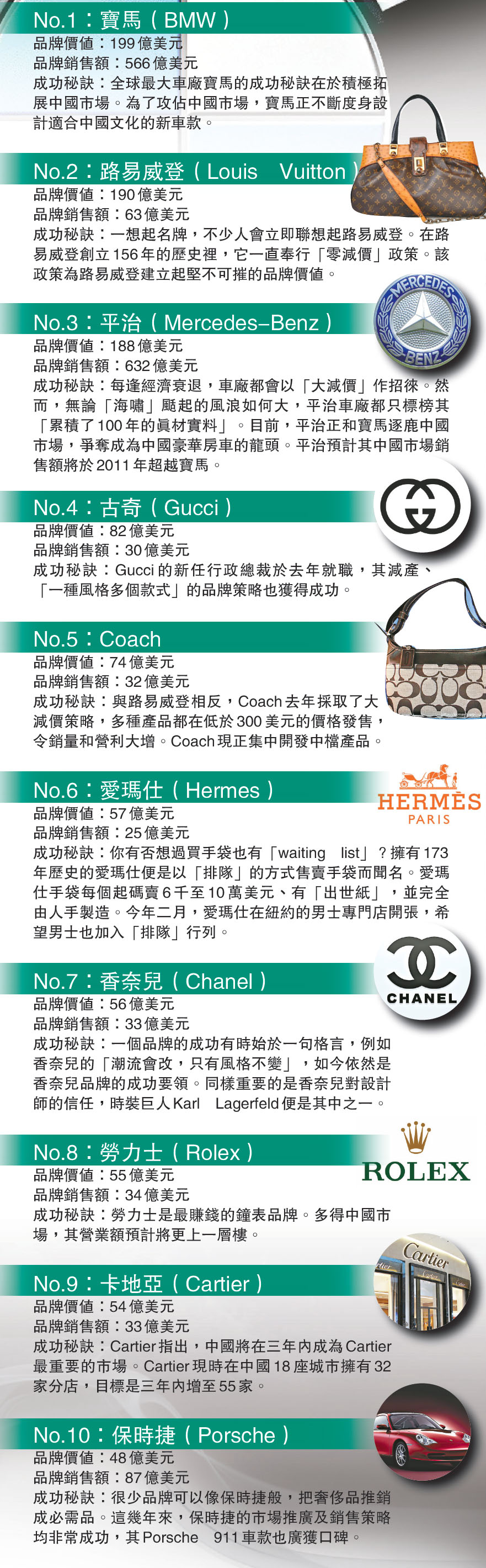 雖然對很多公司來說,去年是災難性的一年,但在《福布斯》最有價值奢侈品品牌榜上排前列位置的公司,去年的成績仍然相當不俗。例如,排第二的路易威登便無視衰退的陰影,2009銷售額年增長超過10%,報63億美元。代表公司75%時裝及皮革用品業務的品牌銷售,在首季也取得雙位數增長。