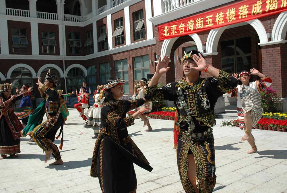 圖:北京首條台灣文化主題商業街標誌建築五桂樓昨日率先揭牌。圖為台灣原住民在五桂樓揭牌儀式上表演台灣特色舞蹈(新華社)