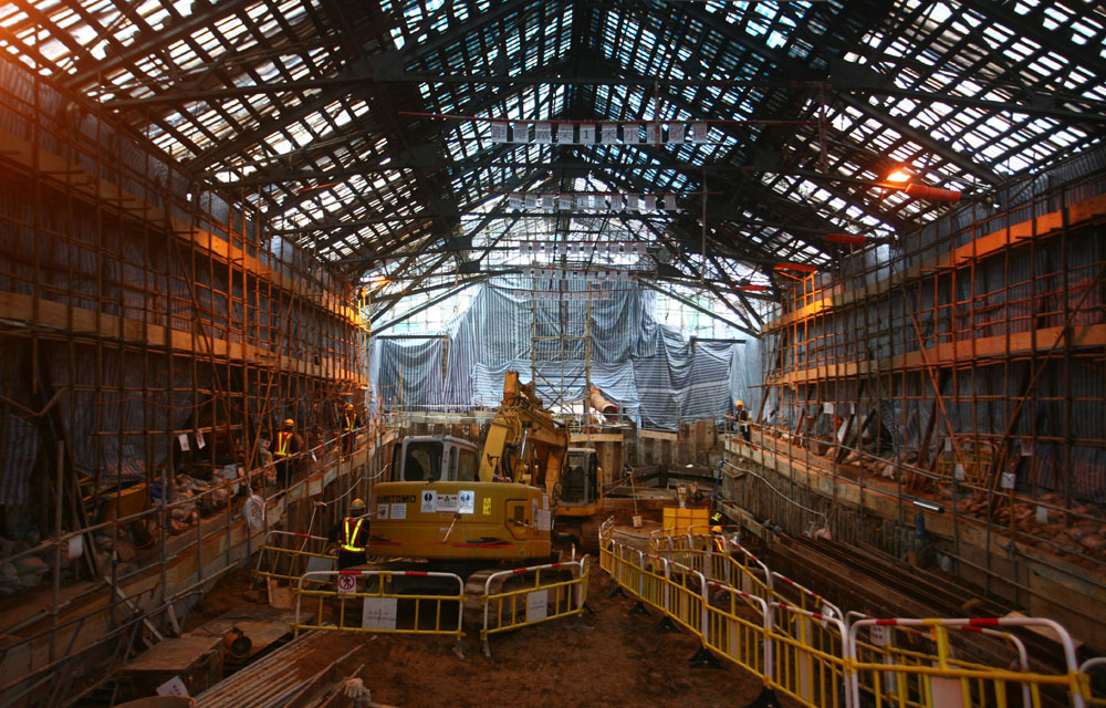 圖:油麻地戲院改建為戲曲活動中心的工程現正進行,戲院外牆被保留,但內部大致需重新改裝(本報攝)