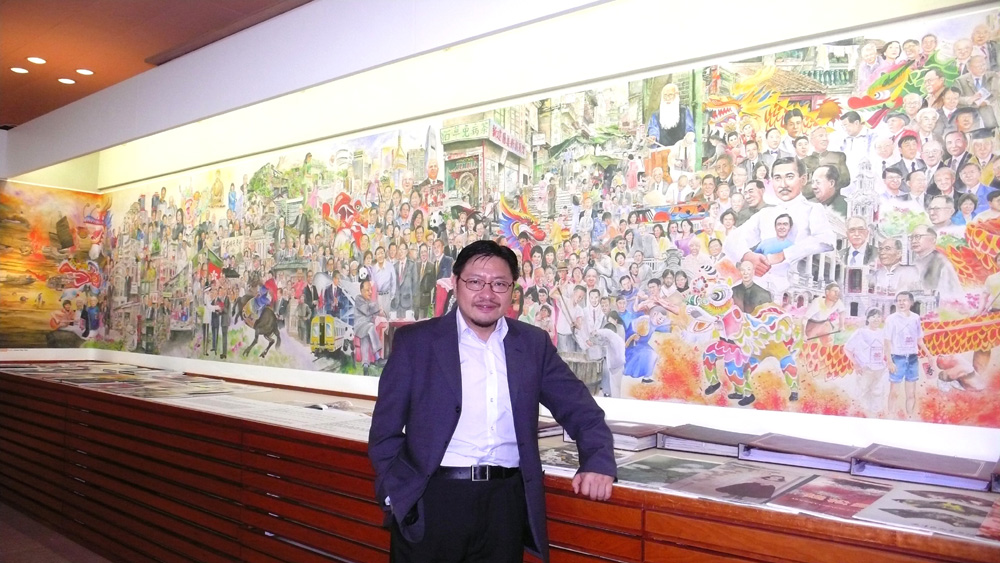 圖:鍾建新身後這幅是巨型水彩畫《天下大同》的複製品,尺寸較細(本報攝)