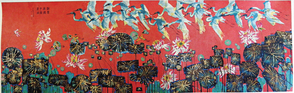 《朝發辰陽》以仙鶴與荷花為題材。上半部分是一群仙鶴在天空飛翔,下半部分是一叢田田荷葉和幾朵婷婷荷花。令人驚訝的是,整個天空一片鮮紅,完全是作者心中的主觀色彩。傳統國畫講究「計白當黑」,他偏偏來個「以黑顯白」──以深色的背景襯托淺色的主體。這種反向繼承不但使畫面看上去主體突出,而且背景深遠,又不失厚重。畫中荷花顧盼生姿,紅白雙色互相交融,荷葉則濃墨重彩,黑、藍、綠等色兼而有之,最後還用金粉勾勒葉脈,充滿一種色彩斑斕、富麗堂皇的強烈裝飾風味和喜慶氣氛,與傳統國畫中清高出世的荷花形象迥然有別。