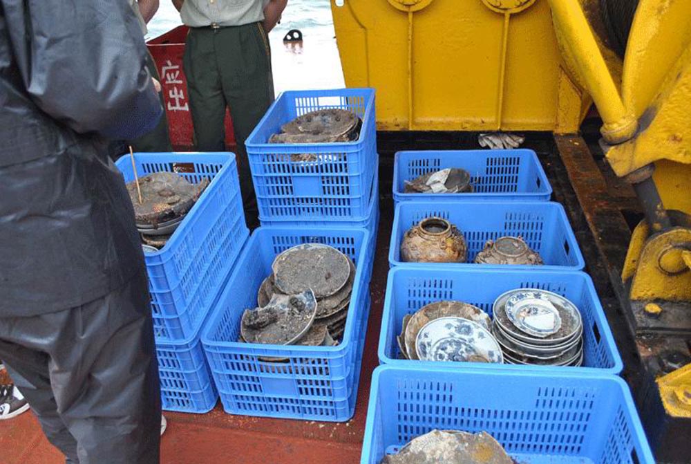 由於南澳天氣、海況複雜多變,水下考古、文物打撈工作被迫中斷。從5月1日開始,南澳天氣狀況有所好轉,水下考古工作重點開始從外圍和表面散落文物的採集,轉向沉船區域內沉船船體及船載文物的發掘。目前已經清理可見的文物種類主要是青花瓷大盤,也有少量碗、缽、杯及金屬凝結物。