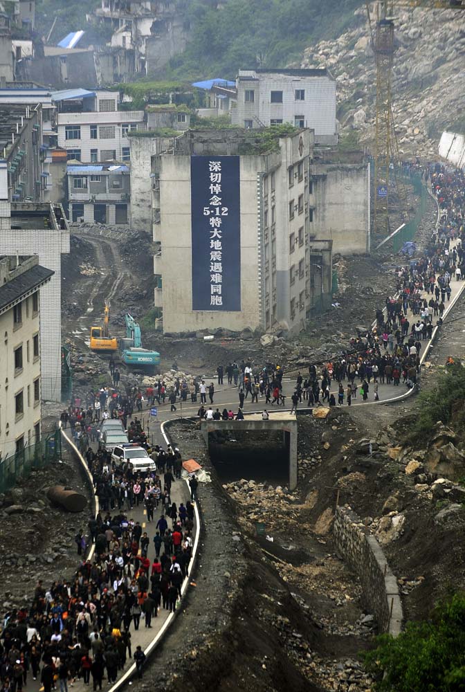 圖:5月12日是四川汶川地震兩周年祭日,北川群眾和從各地趕來的人們在北川老縣城悼念親友,寄託哀思\新華社