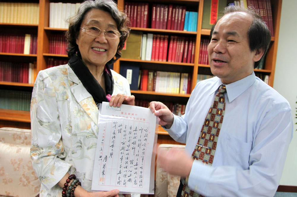 圖:周恩來侄女周秉德(左)到中國國民黨黨史館查詢有關伯父的檔案史料,獲贈1925年周恩來親筆書寫的一份信函(複印件)。圖右為國民黨文傳會黨史館主任邵銘煌\中新社