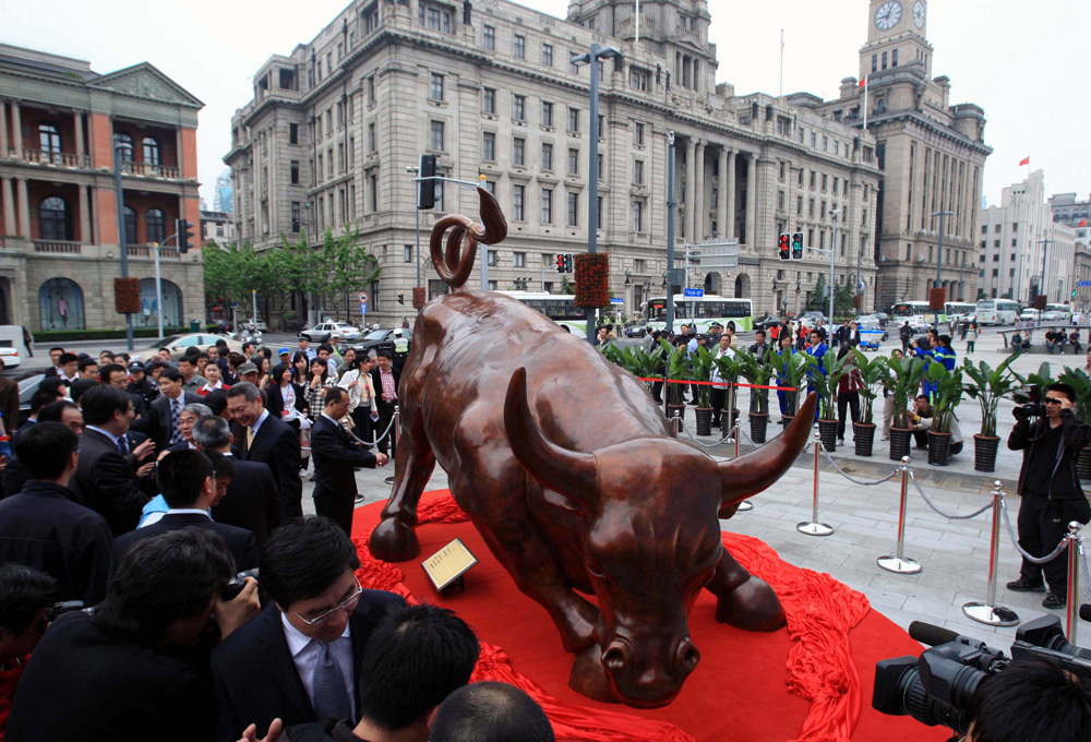 據中新社報道,繼紐約華爾街公牛後,再度擔綱創作上海外灘金融牛的國際著名雕像大師阿圖羅•迪•莫迪卡,特地到來為雕塑揭「紅蓋頭」,他表示,自己特別選用紅色來表現該雕塑作品,因為紅色象徵中國無窮的發展力。