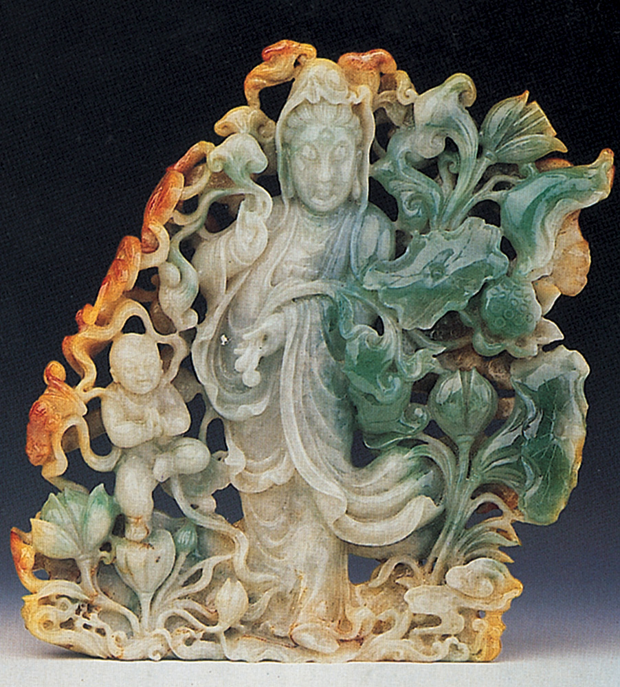 像附圖的翡翠觀音雕像,就是具有上述三種顏色。玉雕家利用各種顏色的分布位置,雕觀音、童子和鏤刻蓮葉,可說雕像的整個結構布局因「色」施藝,巧妙結合,不着痕跡,看似漫不經意,實則匠心獨運。當然,好的雕藝仍要配合好的玉材。