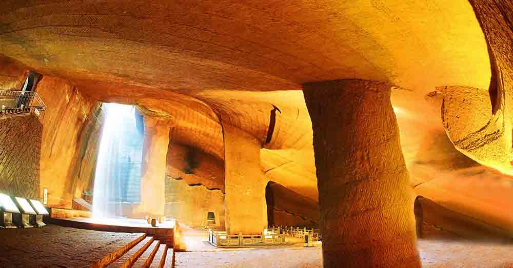 走進龍游石窟,宛若時光倒流到遠古。在方圓0.38平方公里的土丘上似有規律的分布了24個洞窟,每個洞窟內科學地分布着3、4根巨大的「魚尾形」石柱,與洞頂渾然一體。更讓人嘆為觀止的是洞壁、洞頂和石柱上均勻地留下古人似乎帶有裝飾意圖的鑿痕,而「開採年代」、「開採人」、「用途」都是千古不解之謎。