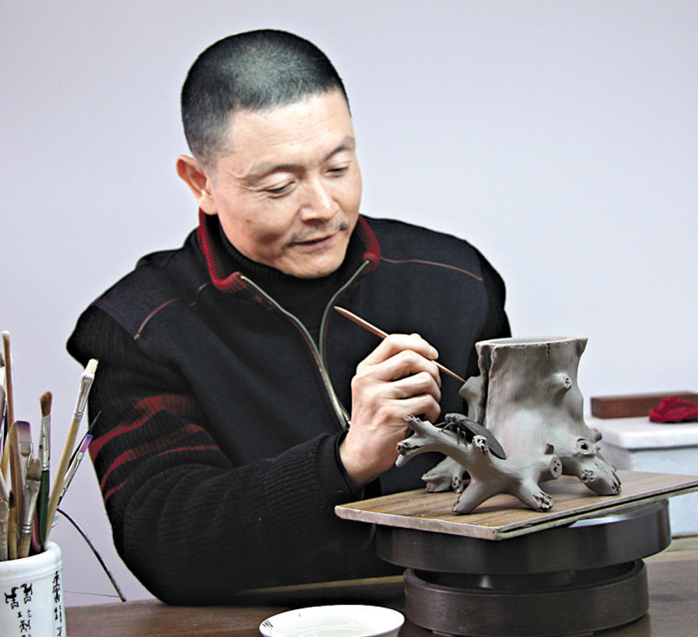 江蘇宜興中青年陶藝家馬志剛的時光是泡在紫砂裡的,他的紫砂作品敦厚、穩重、大氣,多以枯木為表現形式。馬志剛認為,枯樹和生機是相互映襯的,在枯朽中更顯出生命的倔強,在生機中也能見枯朽的內在活力。馬志剛對紫砂藝術表達的堅持是有充足理由的,因為他是一位殘疾人。