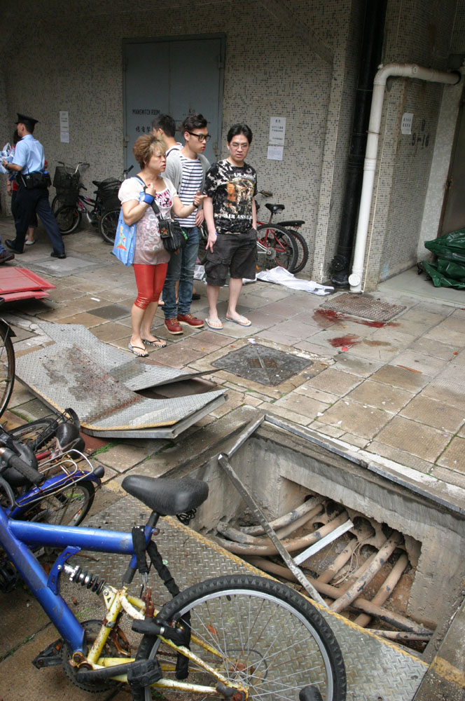 昨日凌晨五時許,一對穿着便服的少年男女,由大廈高處墮下,不偏不倚跌落行人通道一個沙井內,因撞力甚猛,把鐵板壓至呈V形,兩人相擁倒伏井內。保安員聽到巨響查看,立即報警求助,救護員到場證實已死亡毋須送院。警員將兩屍體抬出井外,用帳篷遮蓋。