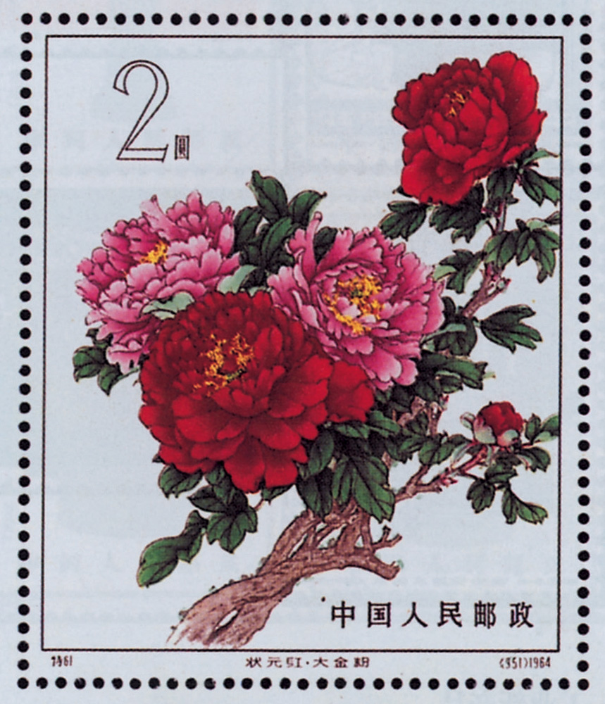 牡丹屬落葉灌木,葉子有柄,羽狀複葉,小時卵形或長橢圓形,花大、單生、通常深紅、粉紅或白色,是著名的觀賞植物。根皮可入藥,有清熱、活血、調經的作用。圖為中共建國以後第一次在特種郵票中發行的「小型張」,編號「特61M」。圖案為狀元紅、大金粉。這幅牡丹圖,典型地體現出被稱之為中國「國花」牡丹的富麗堂皇、雍容華貴、端莊艷美、國色天香的風采,不愧是「花中之王」。