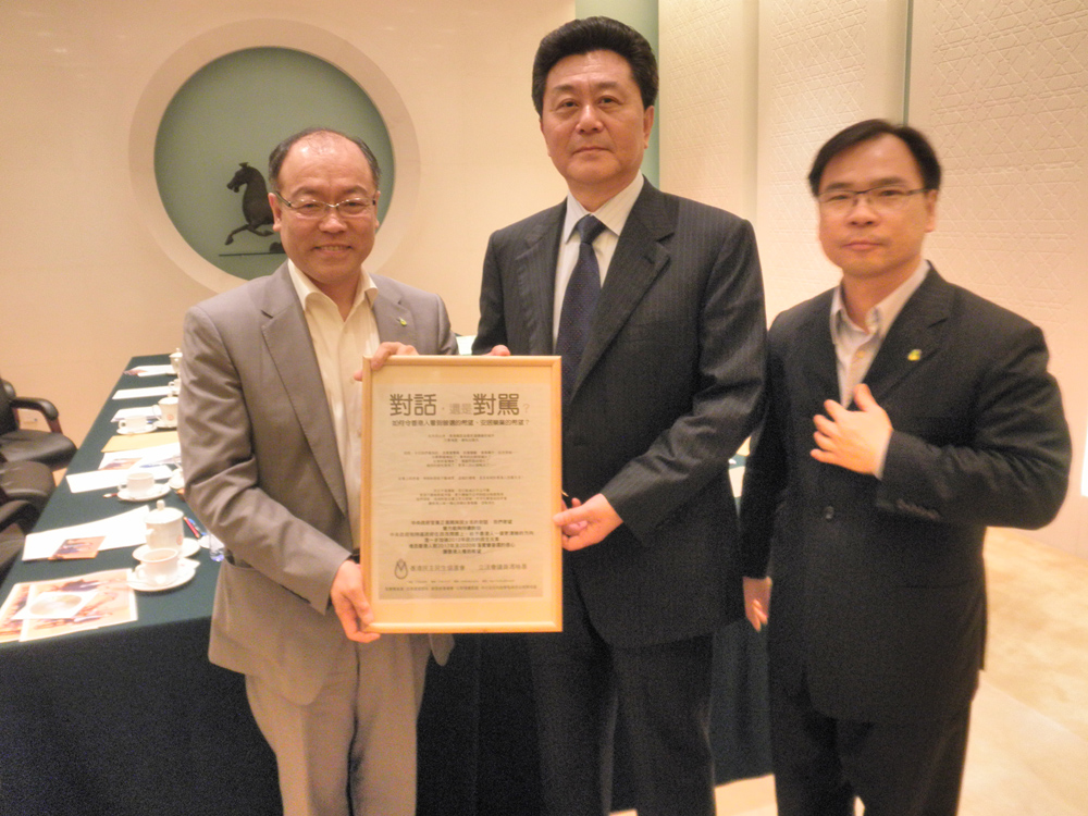 圖:馮檢基(左)和廖成利早前向李剛(中)遞送民協於報章刊登名為《對話,還是對罵?》廣告