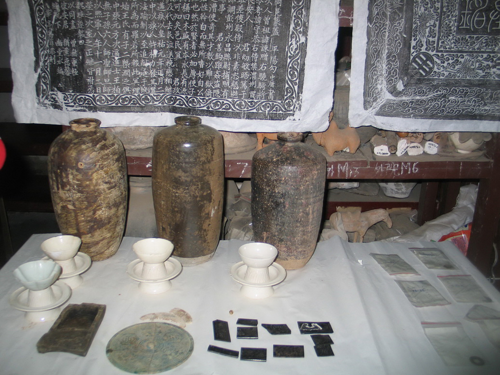 此次發掘出土了一些比較精緻的生活用品,其中有四件白瓷蓮花座盞托,與之相配的有影青六曲瓷盞、白瓷六瓣葵口盞、白瓷圓口小底盞。這四套盞托與盞的出土反映了宋代官僚士大夫的飲茶風尚,也為研究當時的瓷器工藝以及傳播提供了重要的實物資料。墓中還出土了茶葉末釉瓷瓶、骨梳、金珠、銅鏡、銅錢、石硯台、墓誌等文物。其中出土銅錢將近300枚,種類、版別多樣,宋錢有皇宋通寶、太平通寶、淳化元寶、至道元寶、咸平元寶、景德元寶、祥符元寶、天禧通寶、天聖元寶、治平元寶、熙寧重寶、熙寧元寶等種類,錢文有真、篆、草等書體。此外還有漢五銖、唐開元通寶等前朝的銅錢,這些都為研究宋代考古學文化的發展提供了豐富的實物資料。