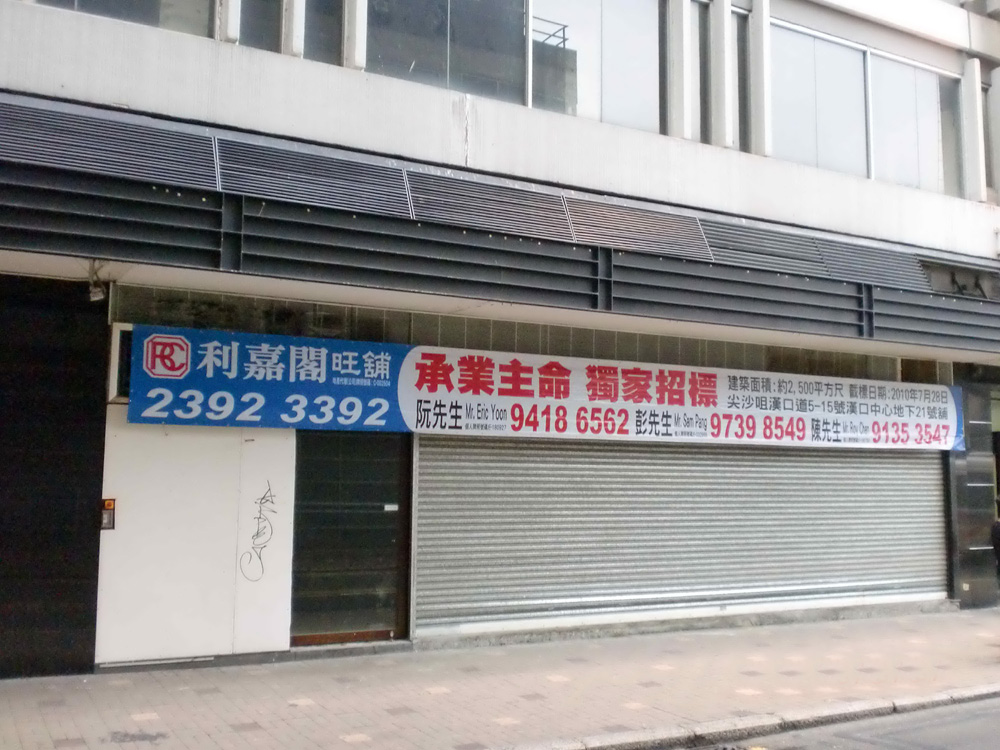 尖沙咀漢口道5至15號漢口中心地下21號舖,面績約2500方呎,委託利嘉閣(工商舖)招標出售,估值約1.2億元,呎價約4.8萬元,七月二十八日截標。