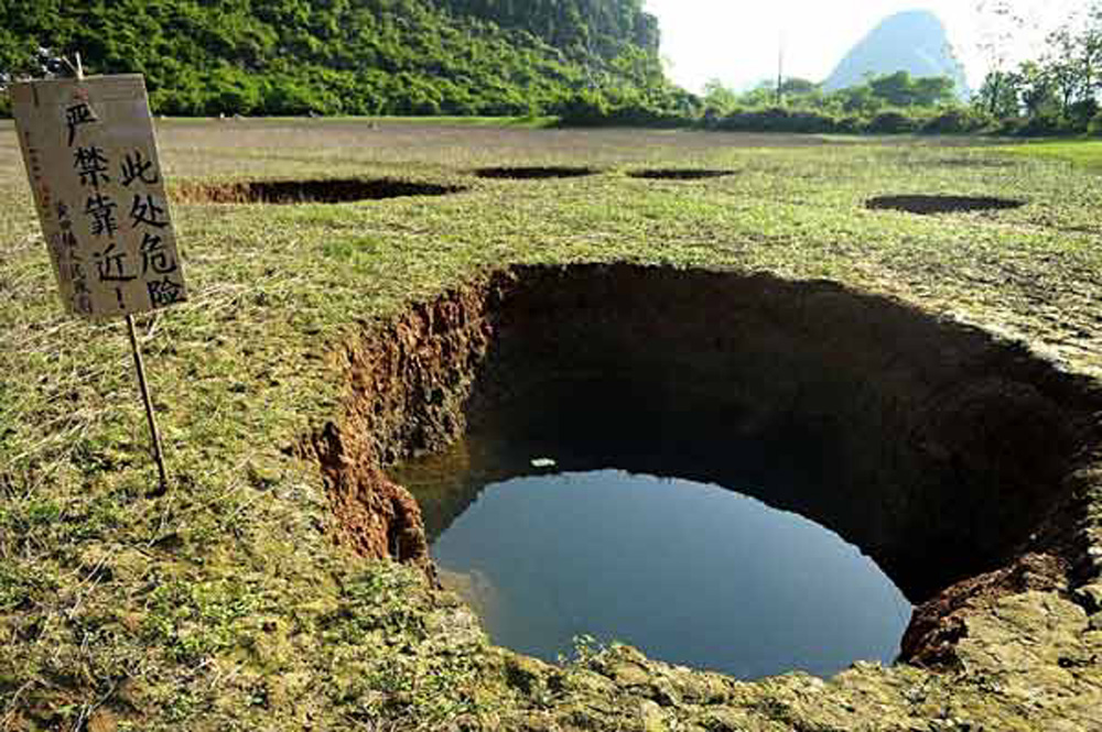 至於廣西吉利村,據了解,地陷還在擴大。自治區國土廳地質環境監測總站應急工作人員施傑說,吉利村出現的地陷是他在廣西見到的最大的地陷之一,初步認為是由於暴雨後地下暗河沖刷泥土引起。而從6月4日到5日,地陷深度增加了5米,達到25米左右,波及範圍達到0.4平方公里。原地陷形成的四個大坑又有擴大,連成了一條近200米的塌陷帶。