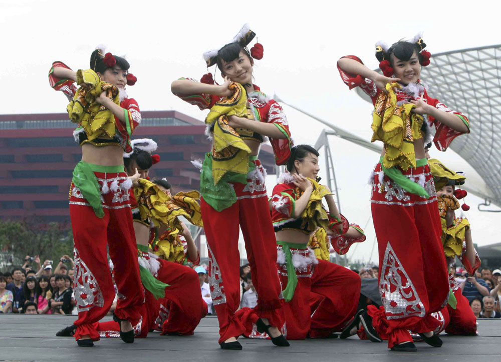 圖:上海世博會「黑龍江活動周」以「冰雪,讓我們與眾不同」為主題,為中外參觀者展示了黑土地上的風土人情。圖為來自黑龍江的演員在世博園區慶典廣場為中外遊客表演歌舞。\新華社