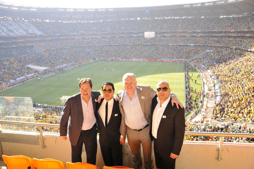 【本報訊】英超伯明翰總裁楊家誠(上圖左二),為答謝伯明翰職員在過去一個球季的超卓表現,不但取得連續十二場不敗及主場十五仗不敗輝煌紀錄,更連奪季度兩個主場最佳接待獎,該港商豪擲七百萬港元招待伯明翰職員到南非觀看揭幕戰及總決賽。