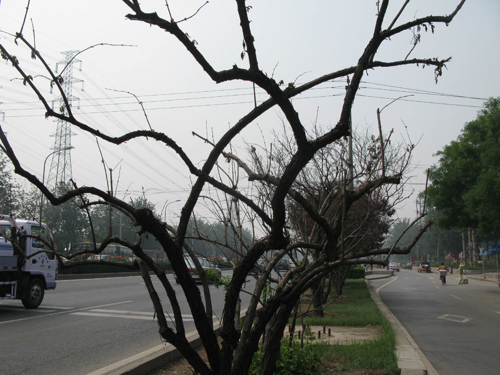 在北京道路兩邊不時可見,灌木綠籬中礙眼地露出一叢叢枯死的枝丫,仍殘留着嚴寒的氣息;草坪像禿子的頭皮,殘缺不全;綠化帶有不少樹木半枯,甚至完全枯死。