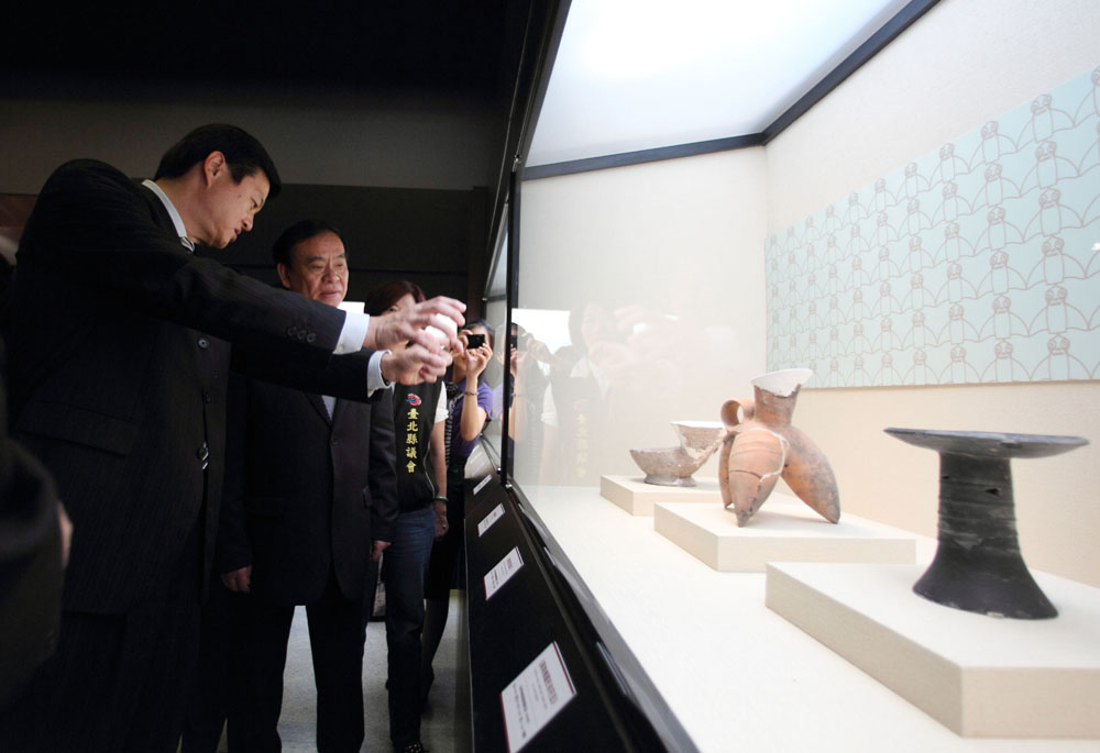 圖:台北縣長周錫瑋(左一)和浙江省長呂祖善(左二)參觀「良渚文化特展」」新華社