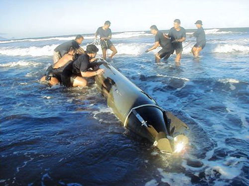 圖:台軍海龍潛艦7年前在「漢光演習」中發生魚雷失蹤事件。圖為2003年台軍救難大隊士兵用手推、用繩索拉,勉強將試射失蹤的魚雷推至淺灘再固定\資料圖片