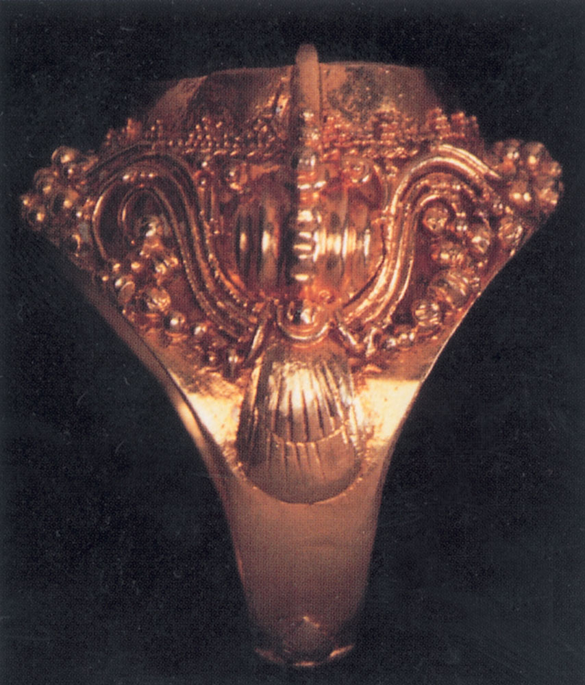 例如附圖的印度黃金指環,工藝甚精美,浮雕圖案富有民族風格,獨特典麗,就是十九世紀初期的代表作。其實,我國晉代時也有鏨刻典麗花紋的金指環,當然風格大相徑庭,但更如鳳毛麟角。
