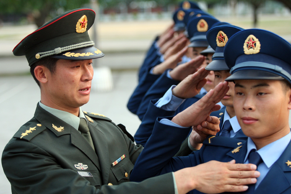 圖:黃立明(左)一絲不苟地糾正新戰士的隊列動作