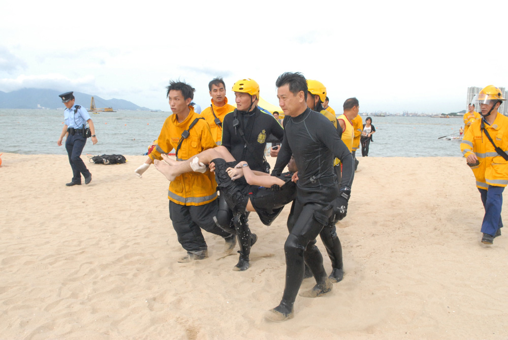 消防船和水警輪趕至,在泳灘一帶水域搜索,消防蛙人更潛落水底搜索,惜一直未有發現。至早上八時半左右,事主父親等家人接到警方通知,趕往現場了解情況。大約九時左右,即在青年失蹤後約四個半小時,消防員終在泳灘離岸約十米處,發現他在海中昏迷半沉浮,口角且有白色泡沫溢出,立即救上岸急救,並由救護車送往屯門醫院搶救,惜已返魂無術。