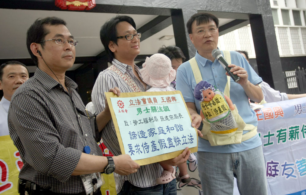 工聯會立法會議員王國興聯同「男士關注組」成員與數位父親昨日一行八人,由中環遮打花園遊行至政府總部遞交請願信,要求政府馬上立法訂立七天男士有薪侍產假。他們身穿上班服,背上假嬰兒撐起太陽傘,寓意在職爸爸「撐」起整個家十分辛苦。遊行期間,隊伍高呼「我愛爸爸,也愛媽媽,立法有薪侍產假」的口號表達訴求。