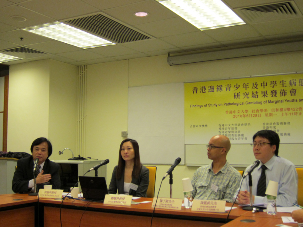 中大社會學系聯同香港社會服務聯會,以及十一間社會服務機構轄下的地區青少年外展隊與賭博輔導服務中心,先後以問卷訪問七百多名年齡十一至二十四歲邊緣青少年和四千七百多名十二至二十三歲中學生,發現九成半邊青和三成中學生,在過去十二個月曾參與以金錢作注碼的賭博活動。逾兩成受訪邊青和百分之一的受訪中學生被甄別為病態賭徒,近四成有賭博的邊青每周賭博一至五次,更有一成每天賭博一次或以上,他們最常賭撲克牌和打麻將。