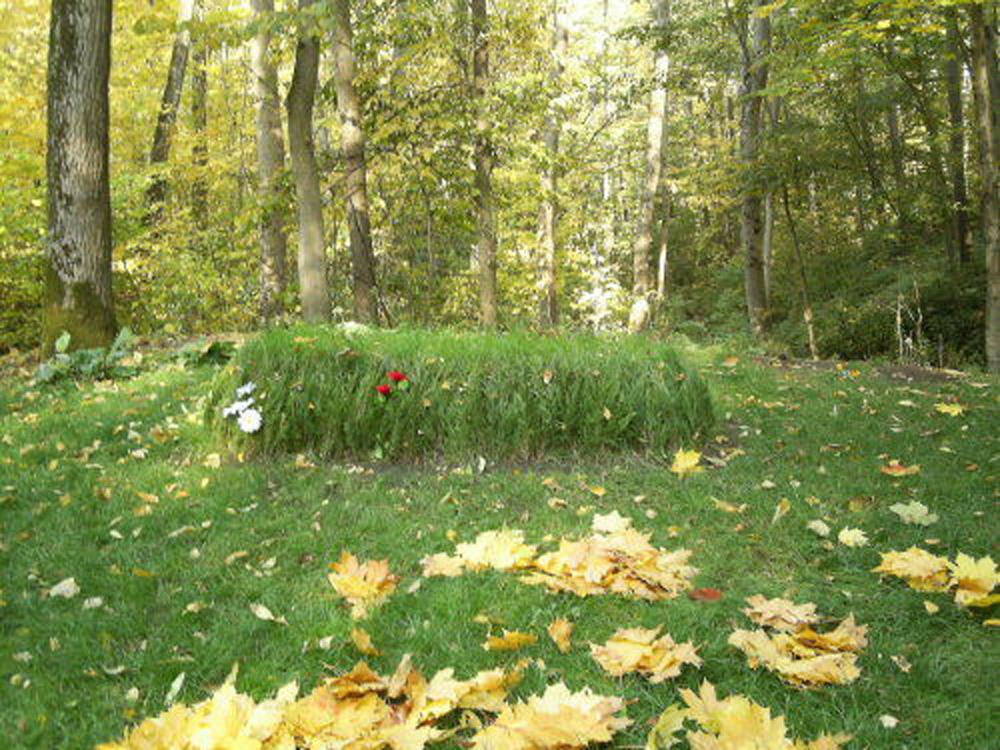大約過了一刻鐘,我領導人在館長的陪同下,冒着濛濛細雨,踏着一條砂石小路,走了四五分鐘,便來到了托爾斯泰墓前。在我們眼前呈現出來的,是一個長約兩公尺,高四、五十公分,寬七、八十公分的小土塚。因為是初春,塚上的青草才吐出了一小點兒嫩綠,墓前擺放着兩束鮮花,周圍的高大樹木尚在「沉睡」。