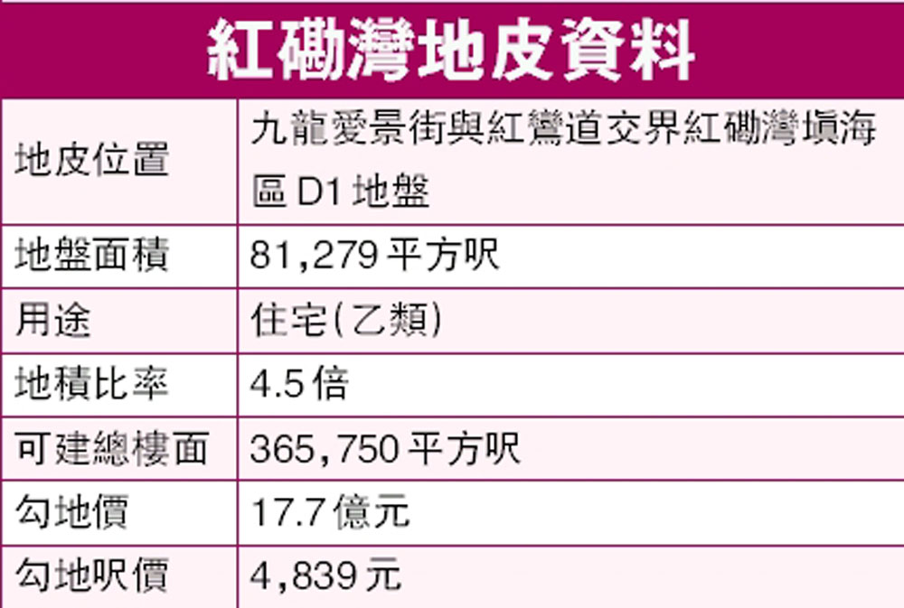 據地政總署資料,紅磡灣填海區D1地皮,位於愛景街與紅鸞道交界,地皮位於海濱南岸前,享海景,惟前臨2幅商用地仍未發展,景觀添變數。該地盤面積81279方呎,劃作住宅(乙類)用途,高限為100米(主水平基準以上,下同),項目需設一條長達20米的通風廊,可建總樓面365750方呎,地積比率約4.5倍,勾地價17.7億元,每呎勾地價4829元。