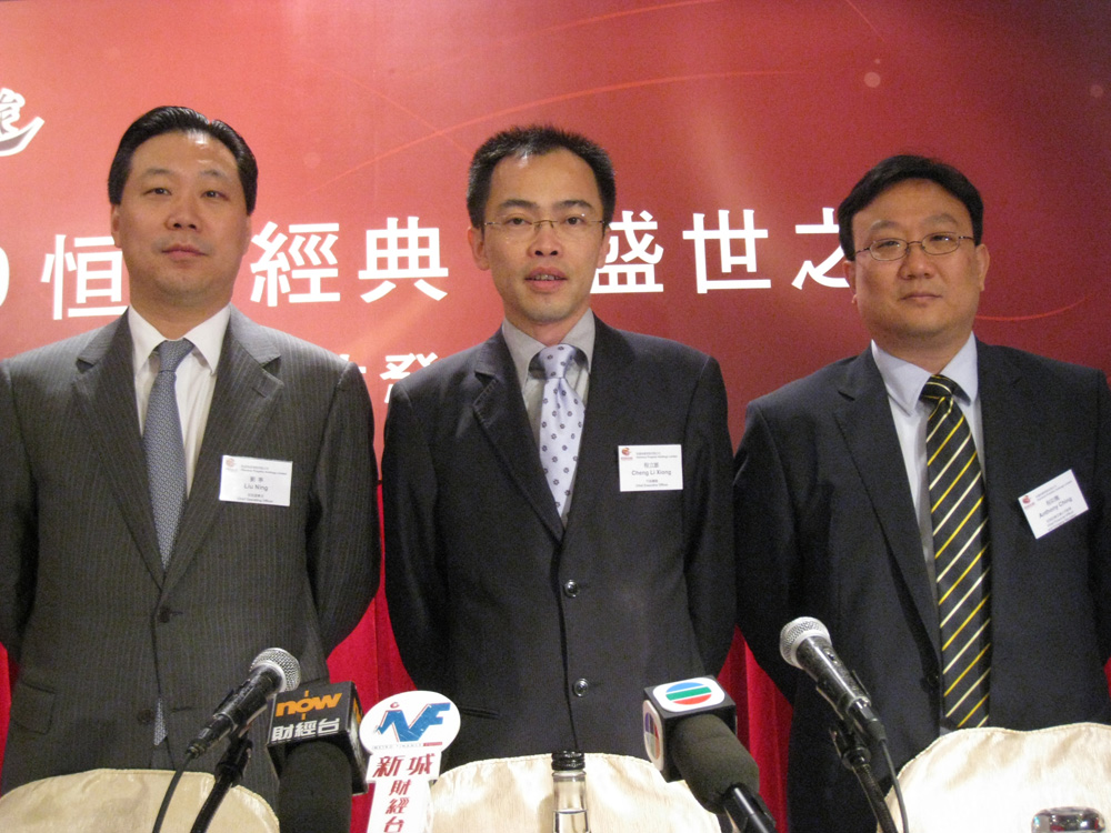 圖:恒盛行政總裁程立雄(中)表示,暫未有減價計劃,未來則視乎市場情況。旁為首席財務官程如龍(右)及首席運營官劉寧